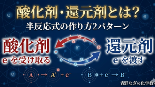 酸化剤・還元剤の定義をわかりやすく解説。半反応式の作り方をMnO₄⁻と(COOH)₂を例に2パターンで丁寧に説明。電子がどちらにあるかで酸化剤・還元剤を見分けよう!