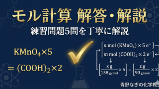 酸化還元のモル計算練習問題5問の解答・解説を丁寧に説明。KMnO₄によるシュウ酸・H₂O₂の滴定、K₂Cr₂O₇によるFe²⁺の定量、質量パーセント濃度・鉄鉱石の分析までSTEPごとに解説!
