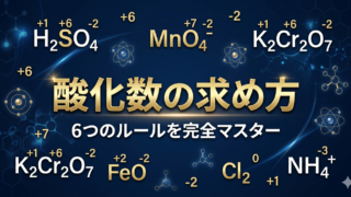 酸化数を求める6つのルールをわかりやすく解説。H₂O・H₂SO₄・MnO₄⁻など具体的な計算例をステップ別に紹介。練習問題10問付きで定着度アップ!