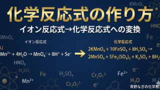 イオン反応式から化学反応式への変換手順を丁寧に解説。KMnO₄とシュウ酸・MnO₂と濃塩酸・銅と希硝酸の3例題をSTEPごとに説明。練習問題5問付きで完全マスター!