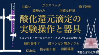 酸化還元滴定で使うビュレット・ホールピペット・メスフラスコの役割と共洗いのポイントを解説。KMnO₄滴定の注意点(硫酸のみ使用可・ガラスコック必須)と実験手順を丁寧に説明!