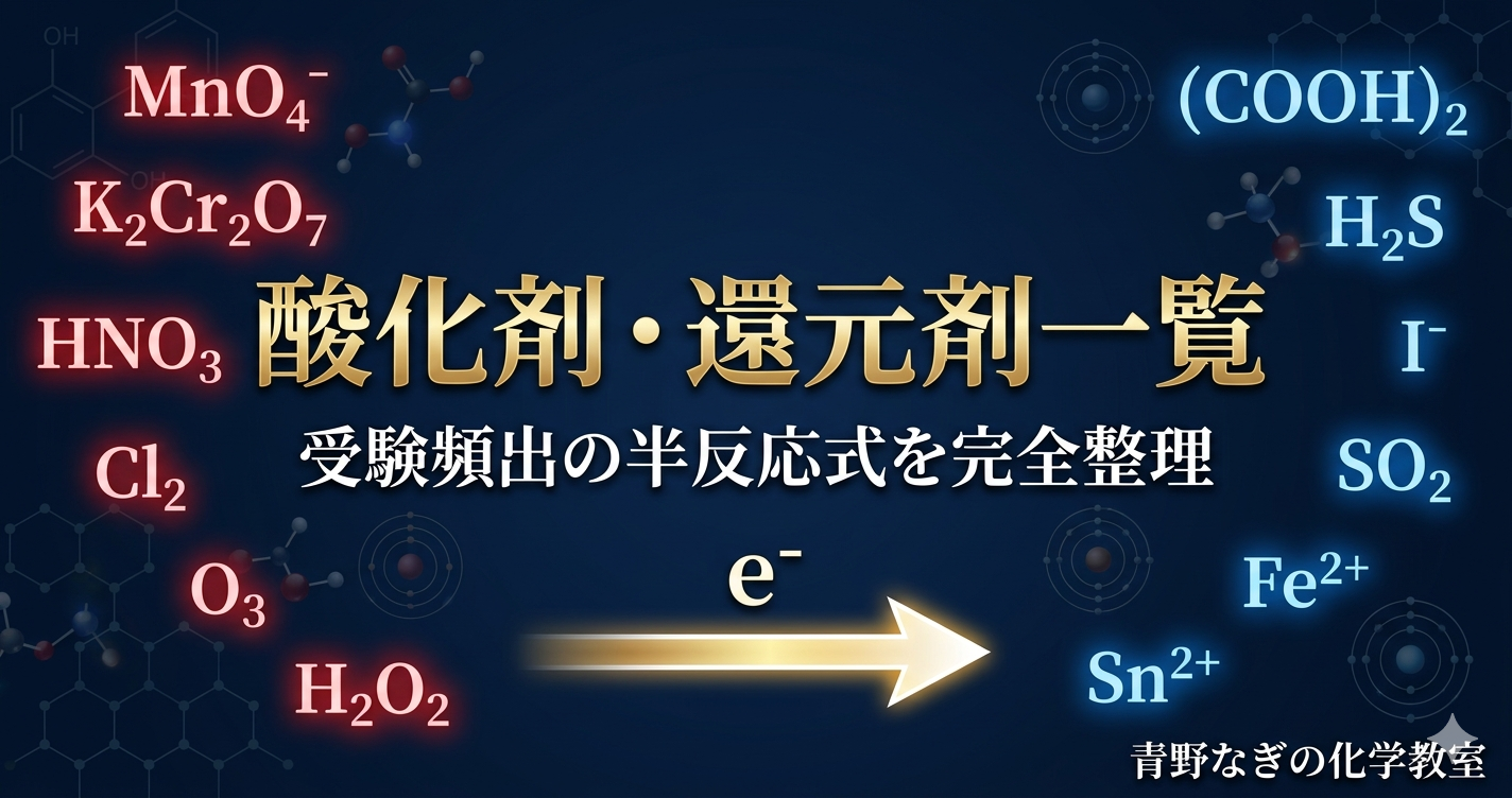 前回は酸化剤・還元剤の定義と半反応式の作り方を学びました。今回は受験で頻出の酸化剤・還元剤を一覧表で整理し、それぞれの具体的な反応例を解説します。一覧表を覚えておくだけで入試問題がグッと解きやすくなりますよ!