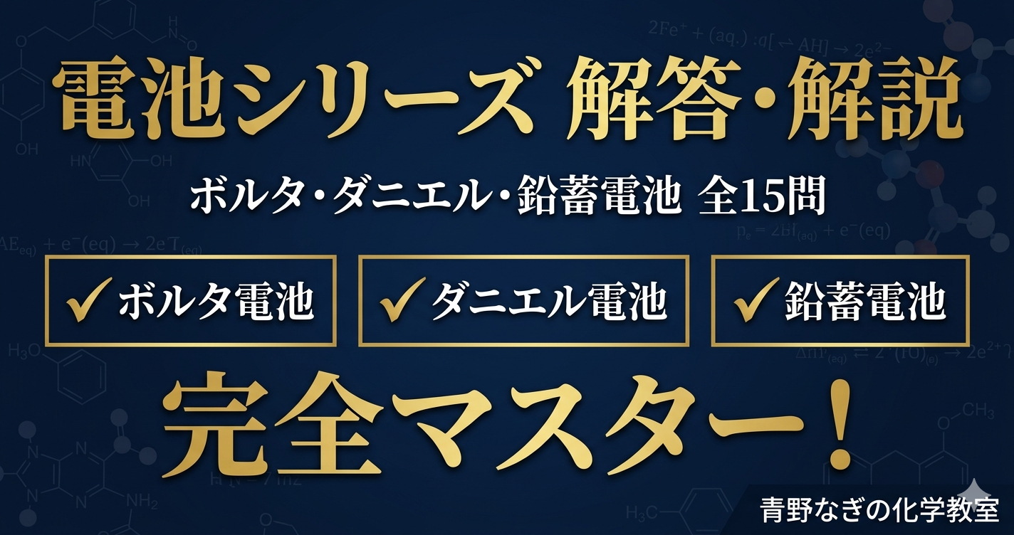 練習問題15問、お疲れ様でした!この記事では全15問の解答と解説を丁寧に説明します。間違えた問題は解説をしっかり読んで、電池シリーズを完全マスターしましょう!
