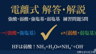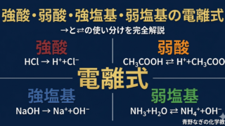 酸・塩基・中和 強酸・弱酸・強塩基・弱塩基の電離式を完全解説【高校化学・中和③】 強酸6種・弱酸7種・強塩基5種・弱塩基5種の電離式を完全網羅。→と⇌の使い分け、多価の酸の段階的電離、化学平衡の基本も解説。電離式を一気に覚えたい高校生必見!練習問題5問付き。 2026.04.02 酸・塩基・中和