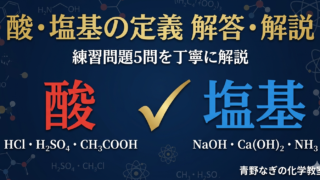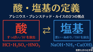 酸・塩基・中和 酸・塩基の定義を3つの視点で解説!アレニウス・ブレンステッド・ルイス【高校化学】 酸・塩基の3つの定義(アレニウス・ブレンステッド・ルイス)を丁寧に解説。すっぱい・苦いなどの身近な特徴から、価数(1〜3価)・強酸6種・強塩基の覚え方・両性物質まで完全網羅。練習問題5問付き! 2026.04.02 酸・塩基・中和