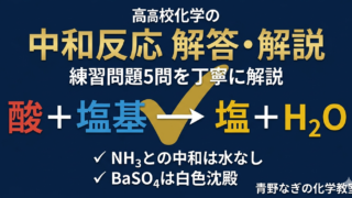 酸・塩基・中和 【解答・解説】中和反応と反応式の作り方 練習問題5問【高校化学】 中和反応式の作り方・塩の化学式・mol計算の練習問題5問を丁寧に解説。NH₃との中和で水が生成しない理由・BaSO₄が白色沈殿になる理由・塩の化学式の作り方まで完全解説! 2026.04.02 酸・塩基・中和
