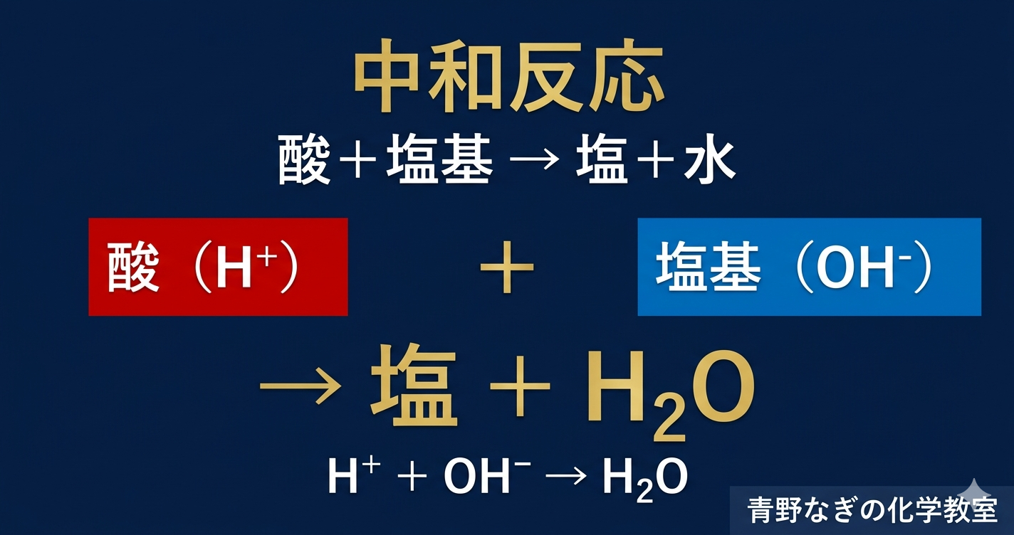 中和反応とは、酸のH⁺と塩基のOH⁻が反応して水(H₂O)を生成する反応のことです。