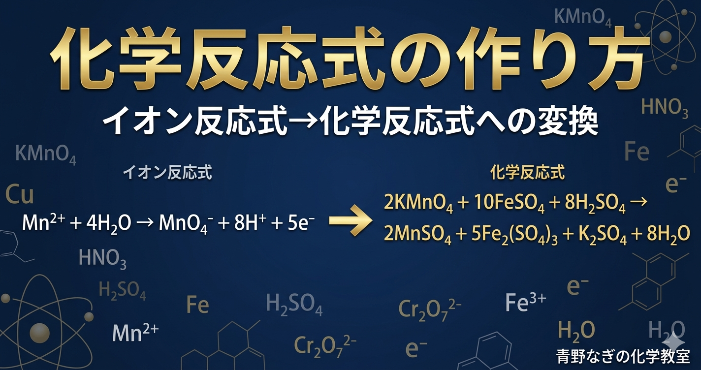 これまで半反応式(イオン反応式)の作り方を学んできました。しかし入試ではイオンを含まない化学反応式を書かせる問題もよく出ます。今回はイオン反応式から化学反応式(分子式)に変換する方法を、具体的な反応例3つを使って丁寧に解説します!
